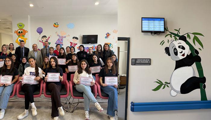 Halil Akez'in Anatoli Lisesi öğrencileri, bu çalışmanın rehberliği altında yürütülen rehberlik altında, Hastane ortamında daha mutlu ve daha güvenli hissetmeyi amaçlayan Rehber, Ayşen Boran Danışmanı ve Pizar Yakürkaya Arklan'ın resimleri ile ilgileniyorlar.